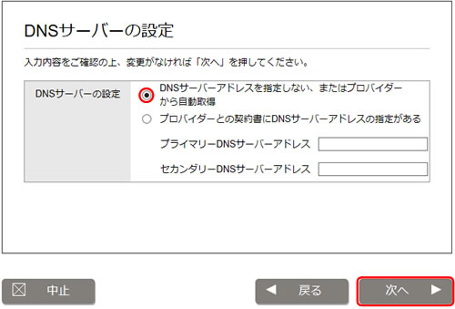 6.DNSサーバーアドレスを指定しない、またはプロバイダーから自動取得を選択し「次へ」をクリック。