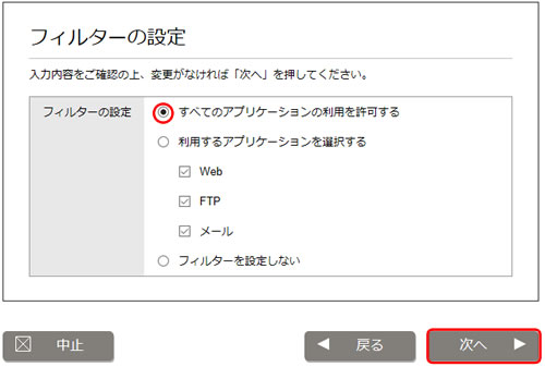 7.全てのアプリケーションの利用を許可するを選択し「次へ」をクリックして、設定の確定をクリック。
