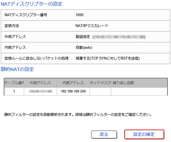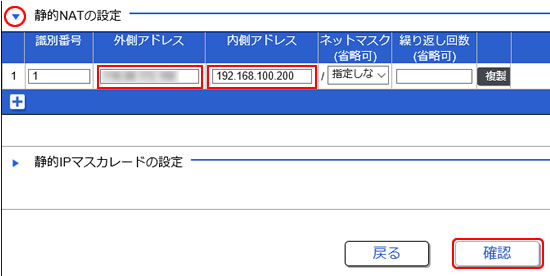 次に静的NATの設定を下記のように設定し、「確認」をクリックします。