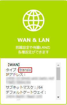 HOME画面の WAN & LAN のタイプが「transix」になっているかご確認ください。