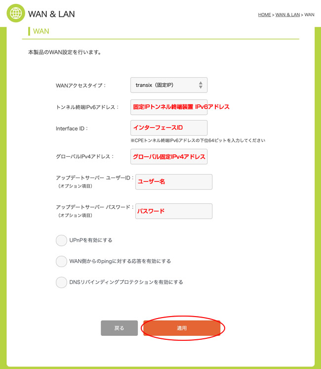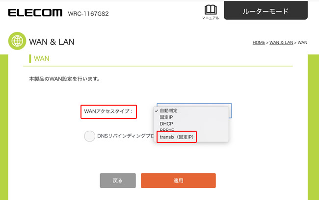 5.WANアクセスタイプから「transix(固定IP)」を選択します。