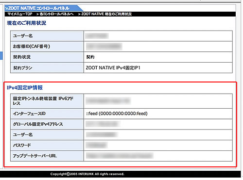 マイメニューにログインし、コントロールパネルのご利用情報にあるIPv4固定IP情報を確認します。
