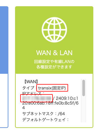 8.HOME画面に戻り「WAN & LAN」のタイプが「transix(固定IP)」になり、グローバル固定IPv4アドレスが表示できているかご確認ください。