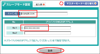 2.ドメイン名とお客様が構築したサーバー(プライマリDNS)のIPアドレスを入力して、登録ボタンをクリックします。