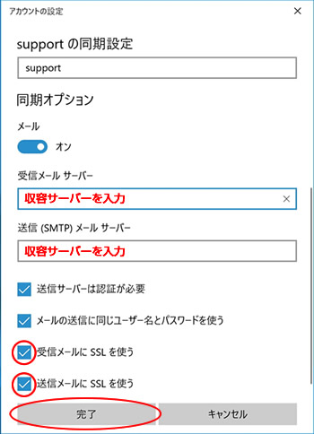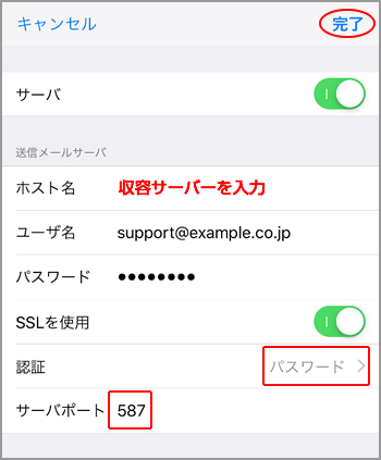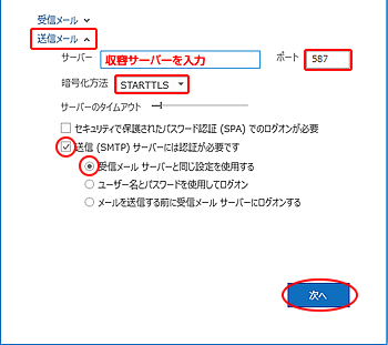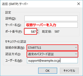 送信メールサーバー 収容サーバーを入力