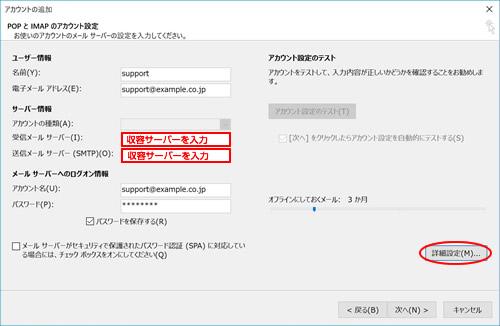 4.受信メールサーバーおよび送信メールサーバーに収容サーバーを入力し、「詳細設定」ボタンをクリックします。