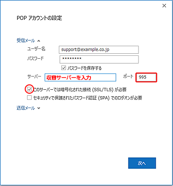 受信メールサーバー(POP) 収容サーバーを入力