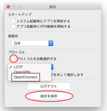 .歯車マークから設定を開き、「プロトコルを自動選択する」のチェックを外し、OpenConnectを選択して設定を保存をクリックしてください。