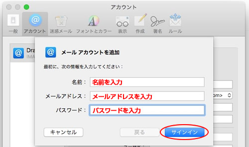 5.「名前」「メールアドレス」「パスワードを入力」をそれぞれ入力して「サインイン」をクリックします。