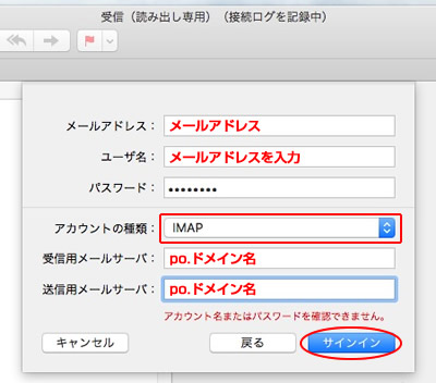 6.ユーザー名に「メールアドレス」を入力し、受信用/送信用メールサーバには「po.ドメイン名」と入力して「サインイン」をクリックします。