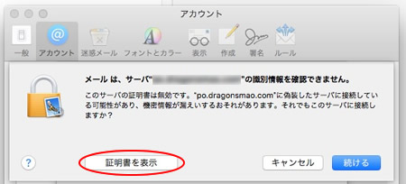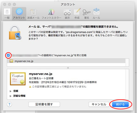 8.「〜接続時に"myserver.ne.jp"を常に信頼」にチェックを入れ「続ける」をクリックします。