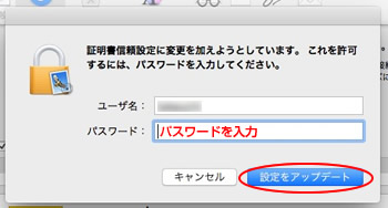 9.以下の画面になりますのでパスワードを入力して、設定をアップデートをクリックします。