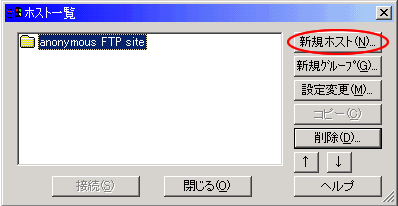 | 2.FFFTPを起動しますと、「ホスト一覧」の画面が表示されますので、「新規ホスト(N)」をクリックします |