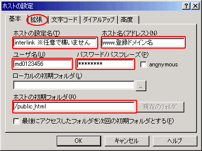 | ホストの設定名(T) | 任意で構いません ※図はinterlink | | ホスト名(アドレス)(N) | www.登録ドメイン名 もしくは 登録ドメイン名のみ | | ユーザ名(U) | 発行されたアカウント名 例)md0123456 | | パスワード/パスフレーズ(P) | 発行されたパスワード(※) | | ローカルの初期フォルダ(L) | ホームページデータを保存されているフォルダー ※空欄でも構いません | | ホストの初期フォルダ(R) | /public_html |