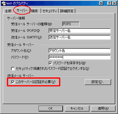 4. アカウントのプロパティ画面が開きますので、「サーバー」タブをクリックし、「このサーバーは認証が必要」のチェックを付けます。