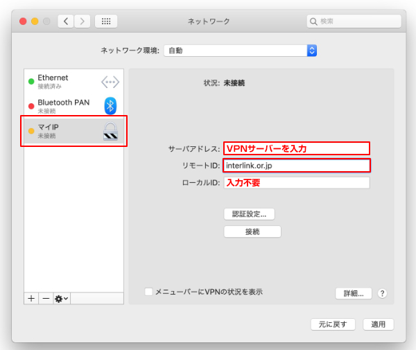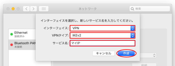 3.インターフェース、VPNタイプ、サービス名入力表示されます。それぞれ下記のように入力して「作成」ボタンをクリックします。