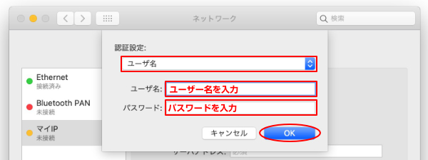 6.認証設定を「ユーザ名」とし、ユーザ名とパスワードをそれぞれ入力します。