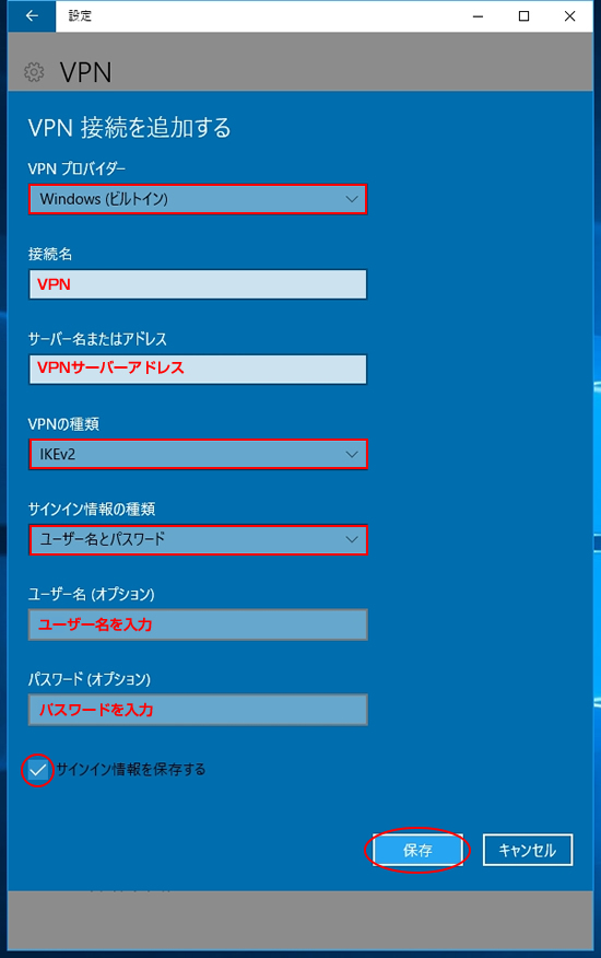 4.VPN接続を追加する画面になりますので、下記の通り入力し「保存」ボタンをクリックします。