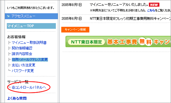 3.左メニューの「各コントロールパネルへ」をクリックします。