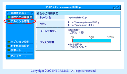 5.契約されているドメインの状態が表示されますので、左側の「アカウント管理」のボタンをクリック