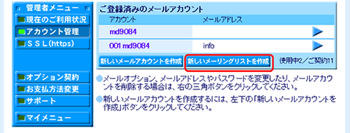 6.アカウント情報が表示されますので、下の「新しいメーリングリストを作成」をクリック