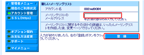 7.新しいメーリングリストの作成画面になりますので、アドレスの@より前の部分のみ記入してください