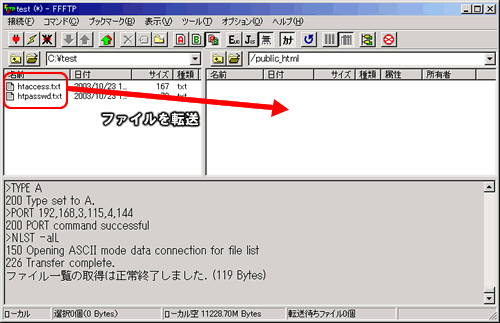 転送したファイルの「htpasswd.txt」を「.htpasswd」に変更する。(ドットがはいります)