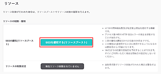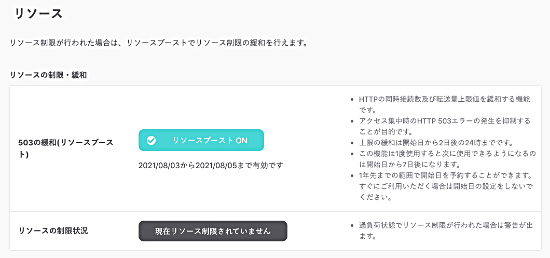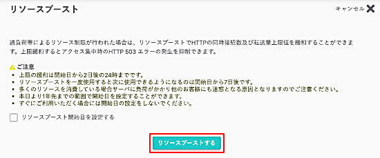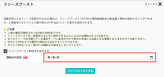 事前にアクセス集中が予想される日が解っている場合は、「リソースブースト開始日を設定する」にチェックを入れ日付を選択してから『リソースブーストする』をクリックします。