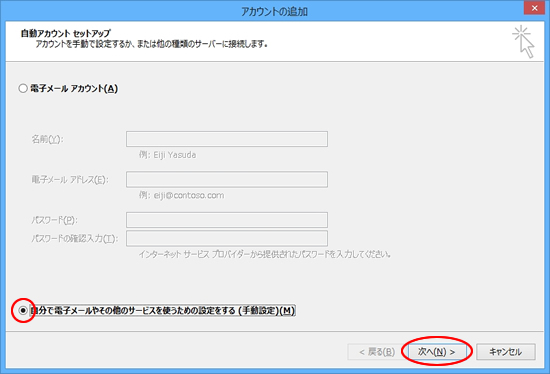4.「自分で電子メールやその他のサービスを使うための設定をする(手動設定)」を選択し、「次へ」をクリックします。