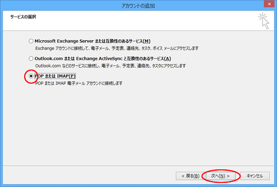 5.「POPまたはIMAP」を選択肢、「次へ」をクリックします。