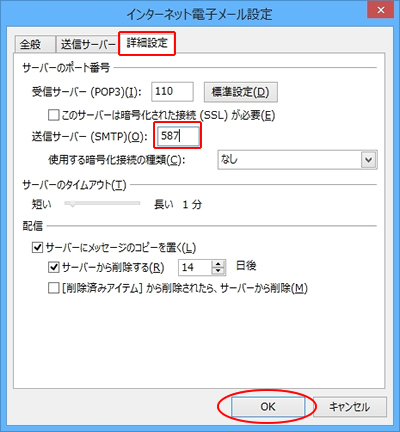 8.「詳細設定」のタブをクリックして送信サーバー(SMTP)に「
