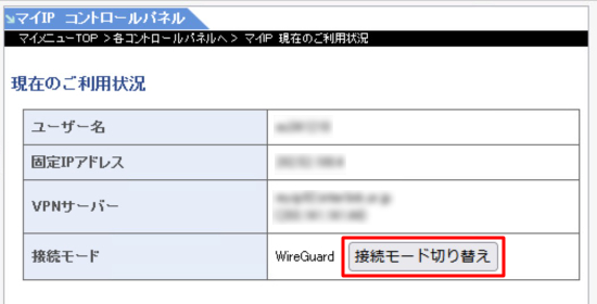 | 接続モードをIKEv2 / L2TP / PPTPからWireGuardに切り替えると、マイIPの専用アプリは利用できなくなりますのでご注意ください。 |