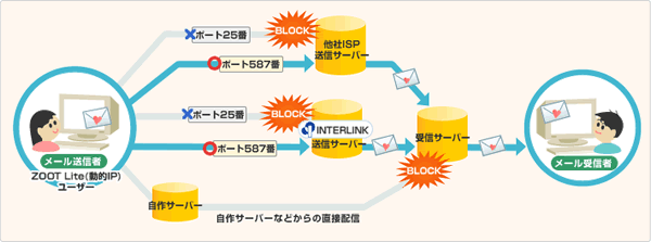 ZOOT/ZOOT NEXT(動的IP)、ZOOT NATIVE(非固定IP)サービスで接続しているお客様に対して、インターリンクでは、お客様が安心してご利用いただけるインターネット環境を目指しOutbound Port 25 Blocking(OP25B)を実施しております。対象となるお客様は必ずサブミッションポート(TCPポート587番)でメール送信していただくことになります。