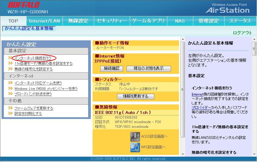 | 1.ルーターにログインし「かんたん設定」の「インターネット接続を行う」をクリックします。 |