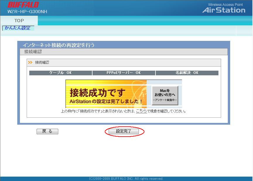 | 4.接続確認画面になり、「接続成功です」と表示されたら接続設定は終了です。「設定完了」をクリックします。 |