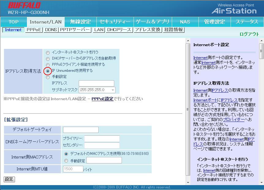 2.「IPアドレス取得方法」で「IP Unnumberedを使用する」を選択します。 (「IPアドレス取得方法」が選択できない場合は、ルーター本体の「ROUTER」スイッチを「ON」にしてください。) |