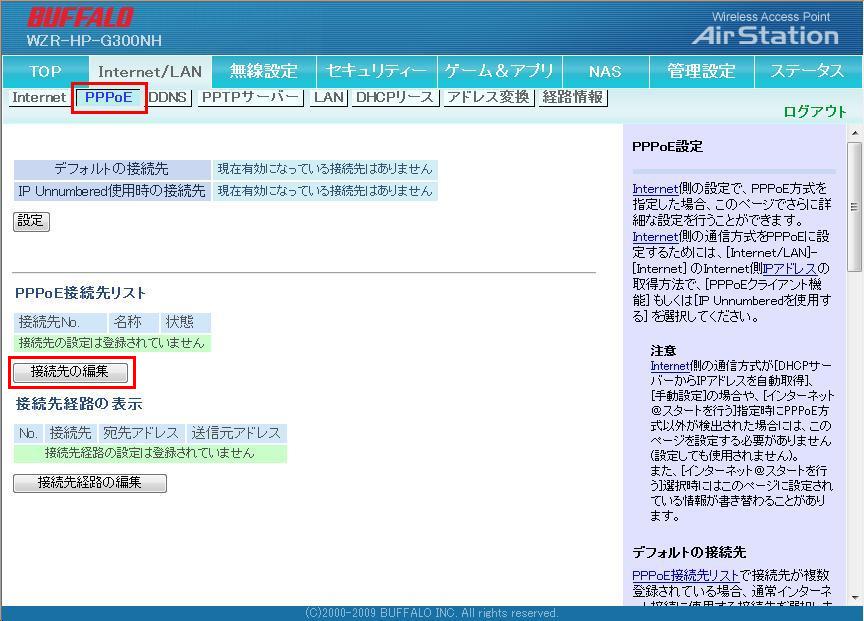 | 3.「PPPoE」を選択し、PPPoE接続先リストの「接続先の編集」をクリックします。 |