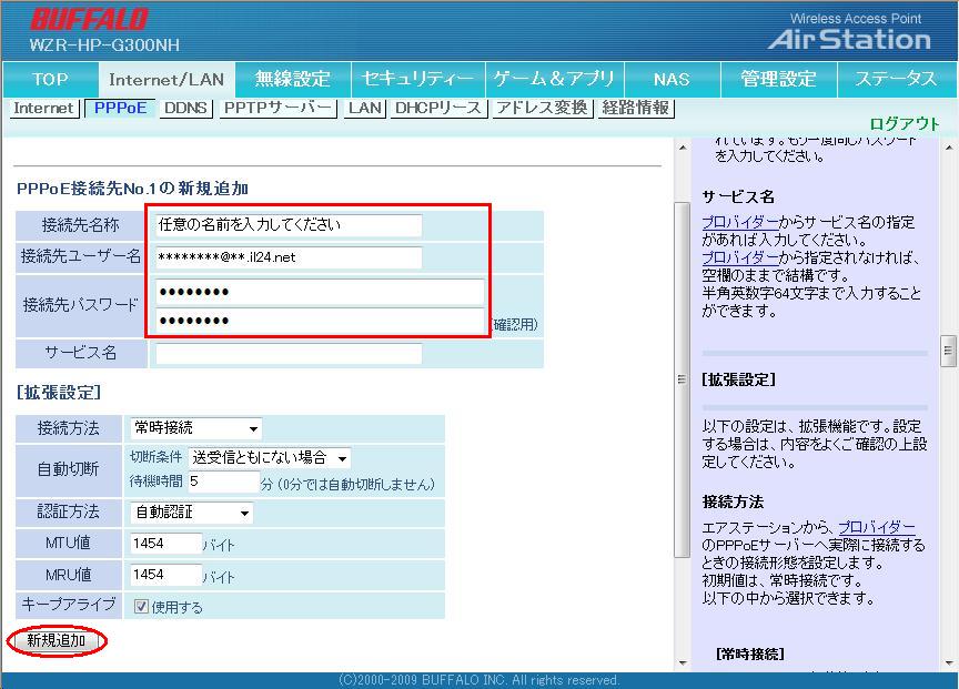 4.任意の接続先名称を入力し、ユーザー名・パスワードを入力して、「新規追加」をクリックします。 (「拡張設定」の内容は任意ですが、認証方法は「自動認証」または「PAP認証のみ」を選択してください。) |