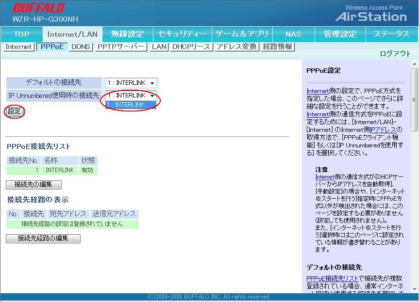 | 6.「IP Unnumbered使用時の接続先」で作成した接続先(接続先名称)を選択し、「設定」をクリックします。 |