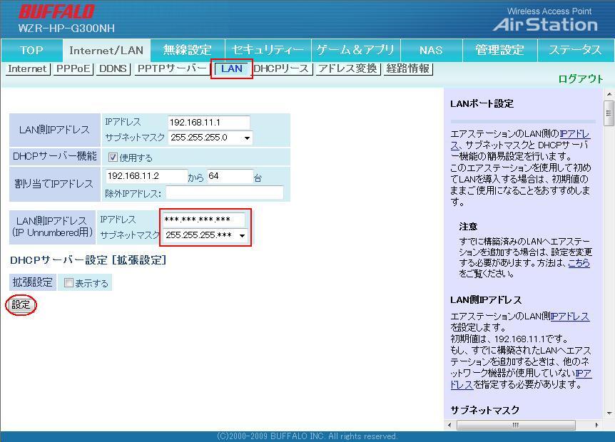 | 7.「LAN」を選択し「LAN側IPアドレス(IP Unnumbered用)」にネットワークアドレス+1のIPアドレスとサブネットマスクを入力し、「設定」をクリックします。 |