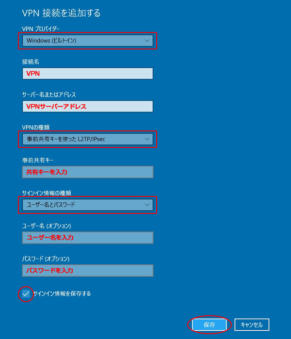 4.VPN接続を追加する画面になりますので、下記の通り入力し「保存」ボタンをクリックします。