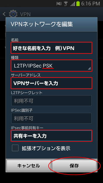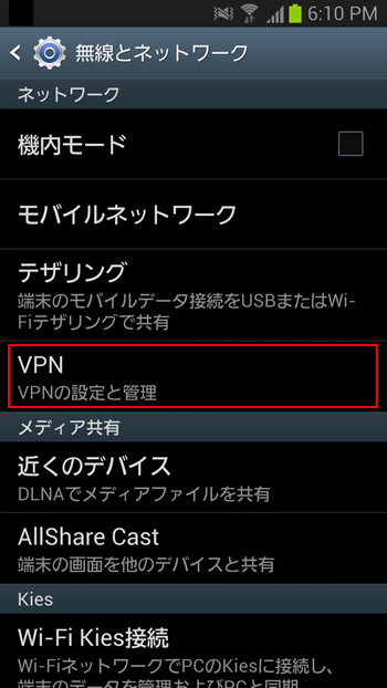 Androidで「グループ専用VPN」のL2TP接続を行う場合は下記をご参照ください。