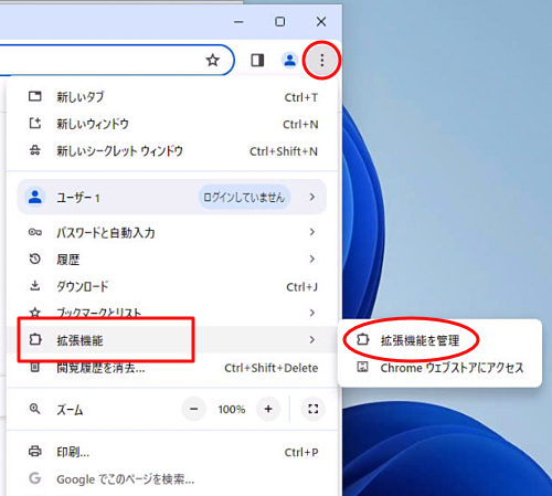 4.Google Chromeを起動し、画面右上より「拡張機能」→「拡張機能を管理」と進みます。